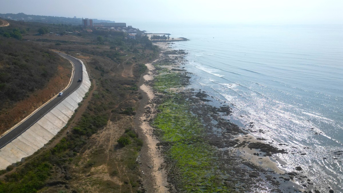 Buổi sáng, nước triều rút xuống làm lộ bãi đá. Bề mặt bãi được khoác một màu xanh tươi mát, làm cho không gian trước biển trở nên dịu dàng.